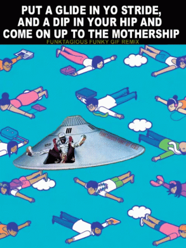 People floating towards the P Funk Mothership, with a glide in their stride, in a funky animated remix.