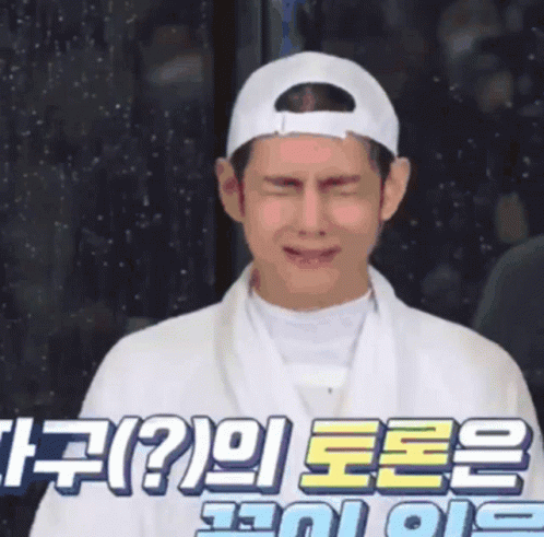 Taehyung from BTS makes a funny crying face while wearing a white baseball cap and robe during a Run BTS segment.