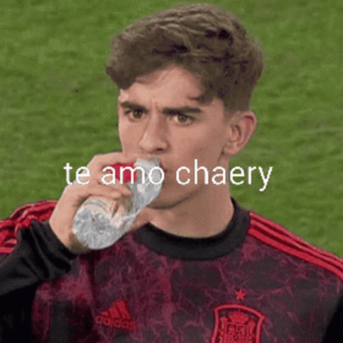 Pablo Gavi drinks water, then looks up, with 'Te Amo Chaery' caption on screen.