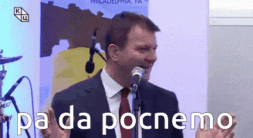 Igor Mirovic, a man in a suit, stands at a microphone, saying "Pa da počnemo" (So let's start).