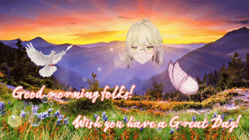A vibrant good morning greeting featuring an anime-style character, a dove, butterflies, and a scenic mountain sunrise.