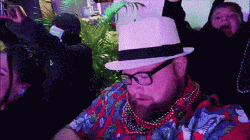 Paging Mr Morrow, the vlogger, celebrates Mardi Gras, wearing colorful beads and a white fedora hat.