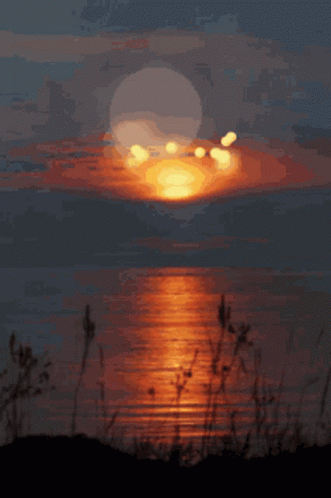A serene sunset or moonrise over a body of water, with reflections shimmering on the surface and a peaceful atmosphere.