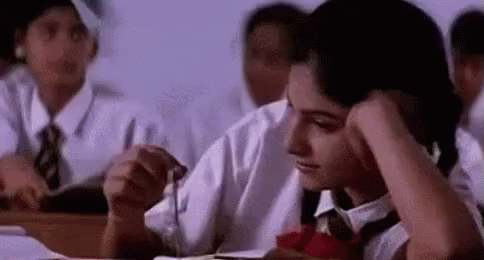 Ayesha, a student, looks thoughtful in a classroom, holding her glasses, evoking themes of first love.