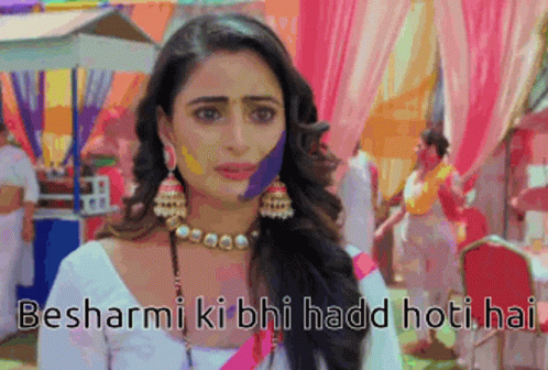 Pakthana, with face paint and traditional jewelry, expresses a strong sentiment with the Hindi caption 'Even shamelessness has a limit' during a colorful Holi celebration.