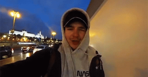 Anton Lazarev gives a thumbs up while taking a selfie in a city at dusk, wearing a hoodie and cap.