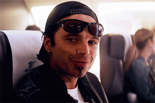 Sebastian Stan as Tommy Lee, wearing sunglasses and a hat, smiles on an airplane.