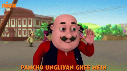 Motu, the cartoon character, says the Hindi idiom 'Pancho Ungliyan Ghee Mein' (Five Fingers In Ghee).