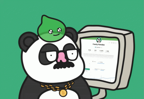 A cartoon Frenly Panda character, sporting a leaf hat and Bitcoin chain, intently analyzes 'Frenly Pandas' NFT data on a computer screen.