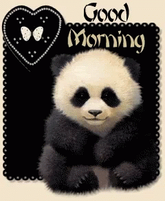 A charming baby panda sits beside a heart with a butterfly, wishing you a good morning.