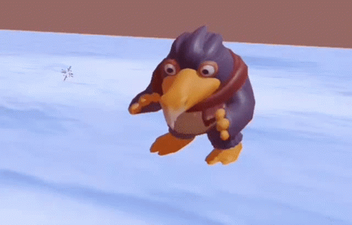 Pango Msm, a 3D animated penguin-like character with a red scarf, slides on an icy surface.