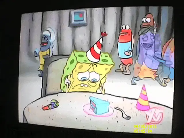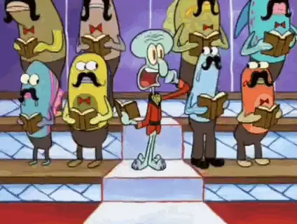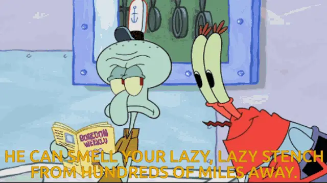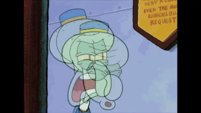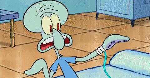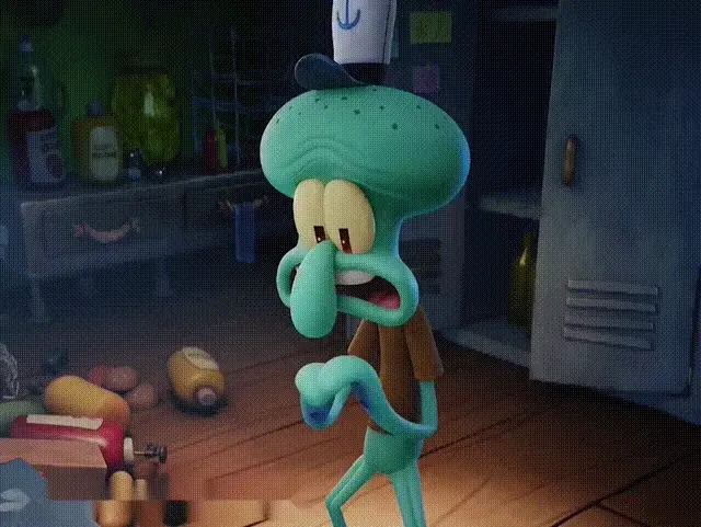 Squidward from SpongeBob SquarePants holds a remote control, looking panicked.