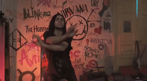 Lizer, a punk rock boy, stands in front of a graffiti-covered wall featuring Nirvana and The Horrors.