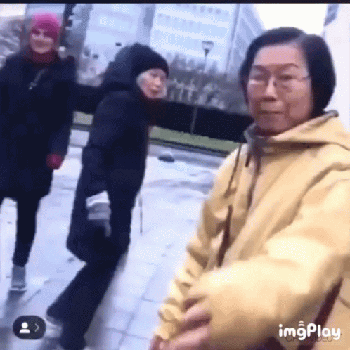 Angry Chinese woman in a yellow jacket gesturing intensely on the street, with another woman in background.