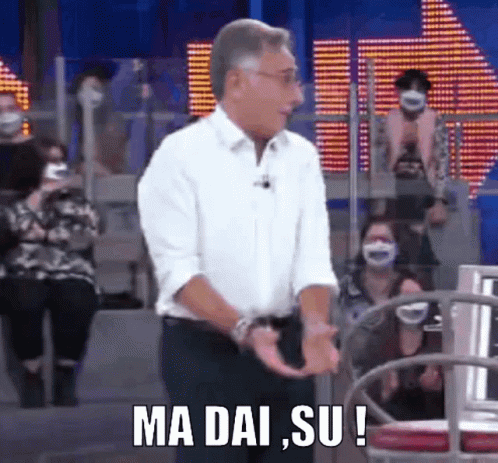 Paolo Bonolis on his show Avanti Un Altro, exclaiming 'Ma dai, su!' with animated gestures.