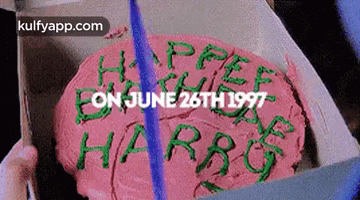 A pink birthday cake with green frosting wishing 'Happy Birthday Harry' on June 26th 1997.