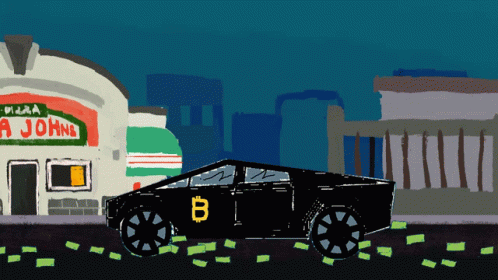 A Bitcoin Cybertruck drives past Papa John's, leaving a trail of money. Happy Bitcoin Day!