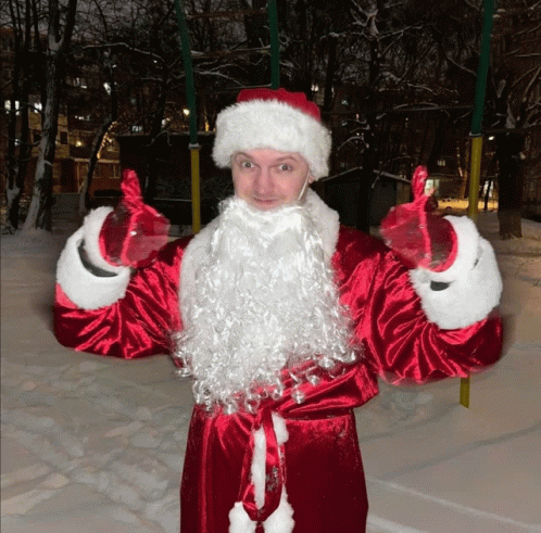 Папич dressed as Santa Claus performs pull-ups on a snowy outdoor playground.