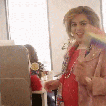 Paquita Salas waves a rainbow flag with a happy smile, celebrating Gay Pride.