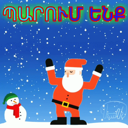 Animated Santa Claus and a snowman dancing joyfully in a snowy landscape, with Armenian text 'We are dancing'.
