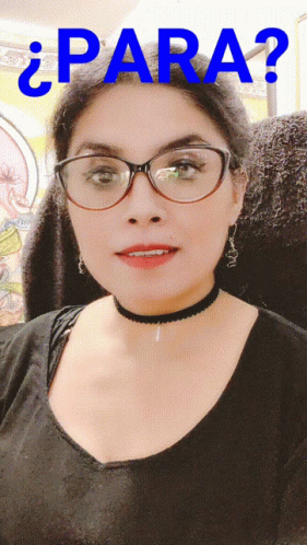 Woman with glasses and choker asks 'Para?' with a hand gesture.