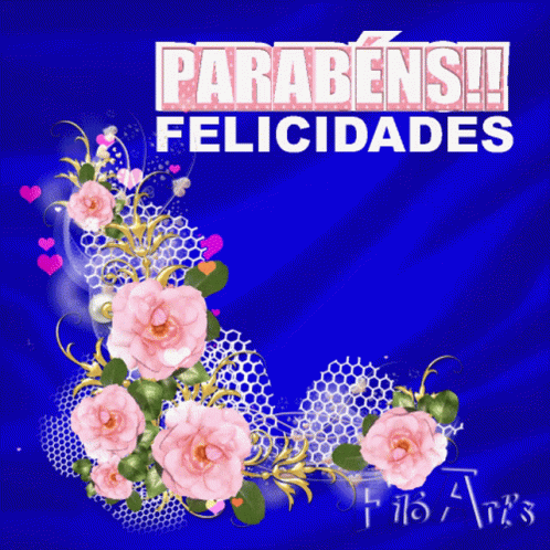 An animated greeting with pink roses and hearts, featuring the celebratory message "Parabéns! Felicidades!" on a changing background.