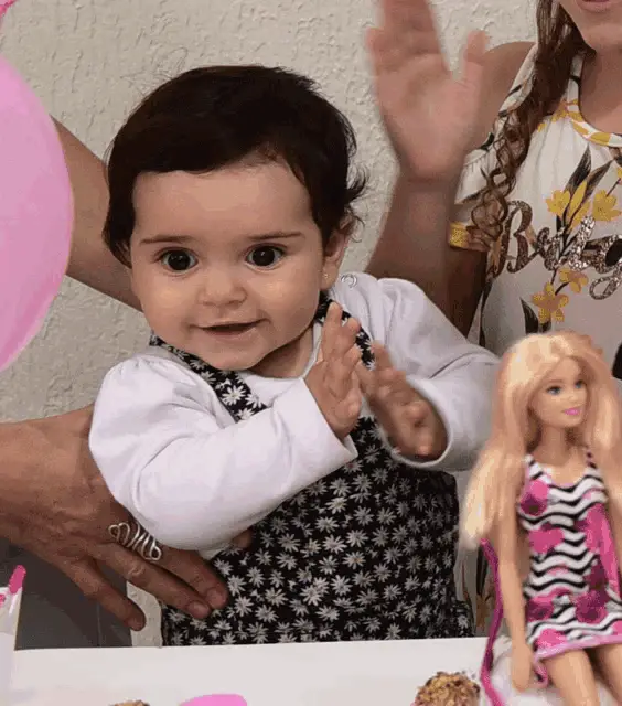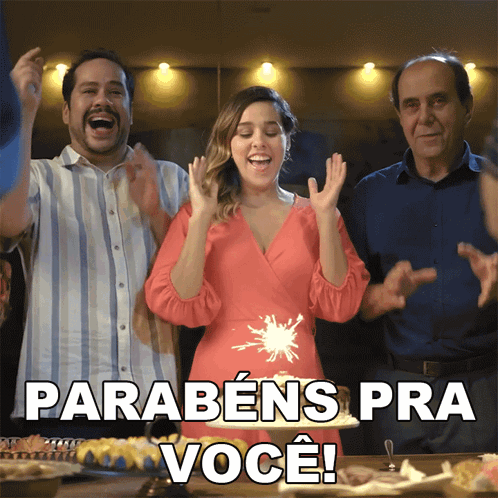 Thati Lopes celebrates her birthday with friends, clapping and enjoying a cake with a sparkler.