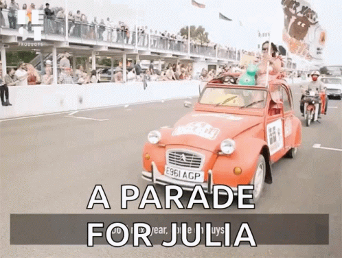 A festive parade for Julia, featuring an orange vintage car with people waving flags, celebrating at a Best Products event.