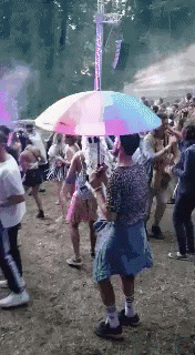 A person joyfully dances in a lively crowd, holding a large, vibrant rainbow-colored umbrella at an outdoor event.
