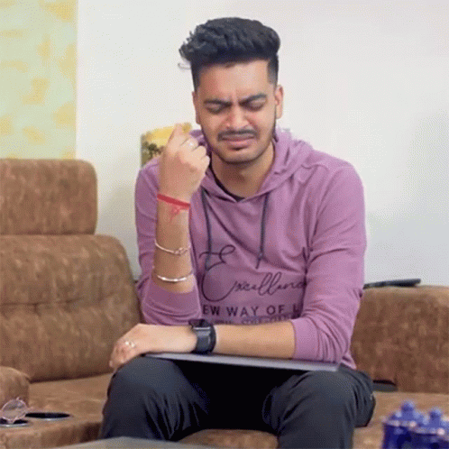 Rachit Rojha facepalming, looking stressed and upset while sitting on a couch, deep in thought.
