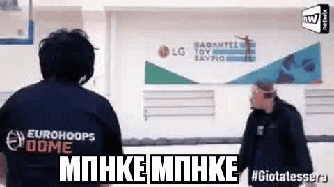 Paraskevas Kyralekos reacts in a gym as Greek captions appear, stating 'It went in, it went in. Whatever goes in is good.'