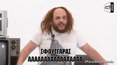 Paraskevas Methana, also known as Sfouggaras, yells with arms outstretched in a Netwix sketch.