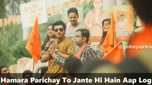Munna Bhaiya (Divyendu Sharma) from Mirzapur speaks into a microphone at a public gathering, saying 'Hamara Parichay To Jante Hi Hain Aap Log'.