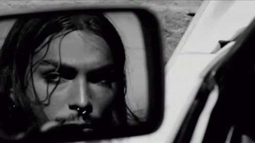 Paris Shadows, a man with long hair and a nose ring, looks at himself in a car's rearview mirror.