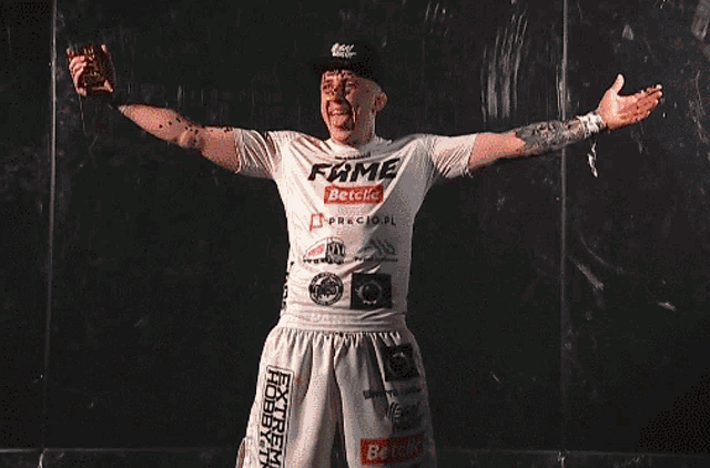 Norman Parke, arms outstretched, gets completely covered in a deluge of shimmering gold liquid.