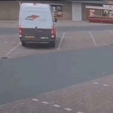A white delivery van executes a flawless parallel park in a parking lot with impressive precision.