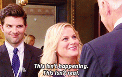 Characters from Parks and Recreation react with disbelief to meeting Joe Biden, with one exclaiming 'This isn't happening. This isn't real.'