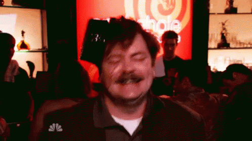 Ron Swanson shows off his unique dance moves in a bar from Parks and Recreation, with the NBC logo visible.