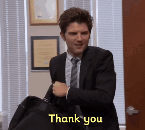 a man in a suit and tie is holding a briefcase and says thank you