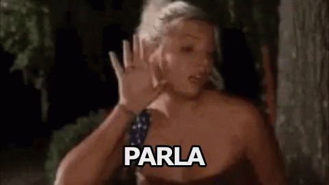 A woman gestures with her hand to her ear, urging someone to 'Parla' (Speak) as the word appears on screen.