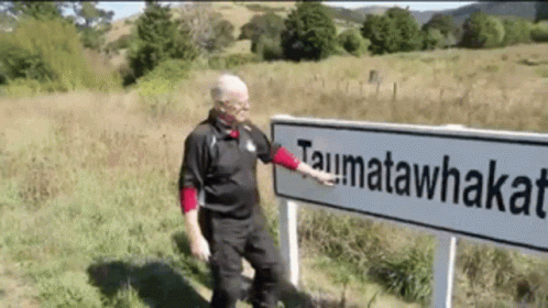 A man points to the sign for Taumatawhakatangihangakoauauotamateaturipukakapikimaungahoronukupokaiwhenuakitanatahu, the longest place name.