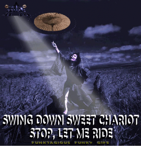 Animated graphic for Parliament Funkadelic's 'Swing Down Sweet Chariot', featuring a figure and UFO.