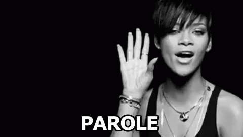 Rihanna gestures 'bla bla bla' with her hand, indicating disinterest in a black and white shot.