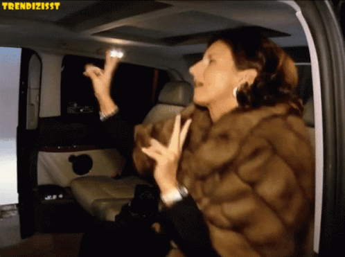 Claudia Obert celebrating excitedly in a fur coat in the back of a luxurious car.