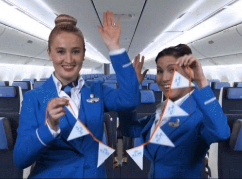Two smiling KLM flight attendants in blue uniforms celebrate, holding a string of white triangular KLM flags inside an airplane cabin.