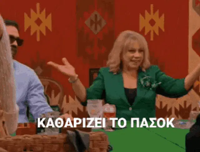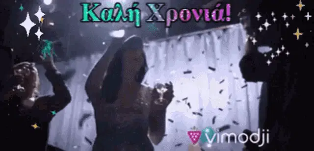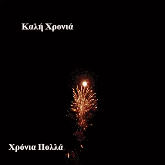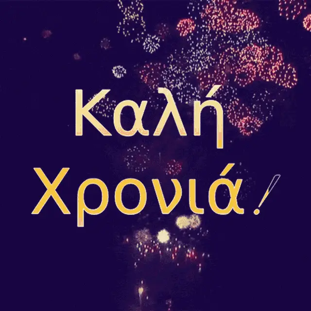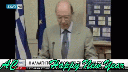 Greek politician Costas Simitis delivers a speech, followed by festive New Year's Eve celebrations, with 'Happy New Year' overlay.