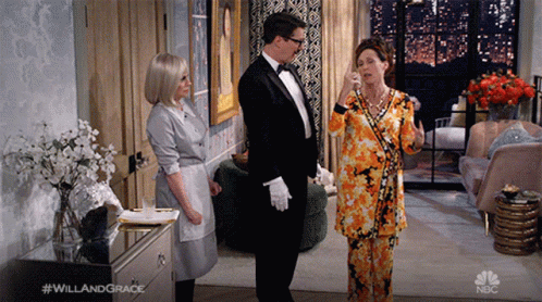 Molly Shannon's character, Val Bassett, appears to pass out and is caught by Jack McFarland in a comedic scene from Will & Grace.