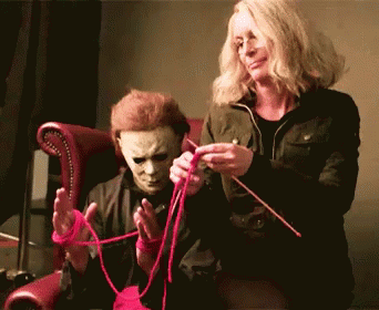 Jamie Lee Curtis knits while Michael Myers holds yarn, a humorous behind-the-scenes moment.