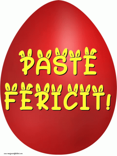 A vibrant red Easter egg displays the Romanian greeting 'Paste Fericit' (Happy Easter) in yellow text.