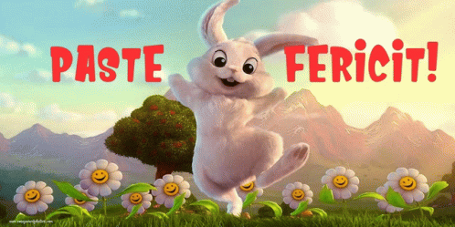 A cheerful Easter bunny hops in a vibrant spring landscape with flowers and mountains, wishing 'Happy Easter!'